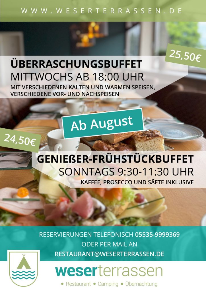Für die Saison 2025 sind noch Plätze frei. 800 € pro Saisonplatz. Infos und Reservierung an info@weserterrassen.de